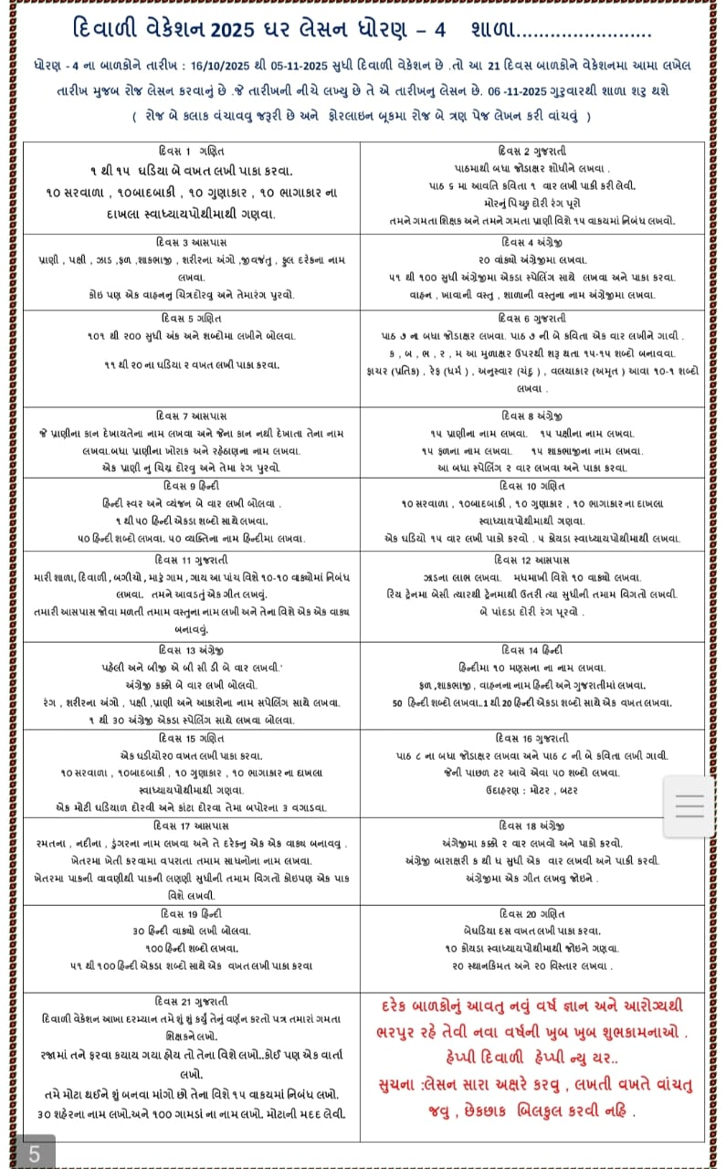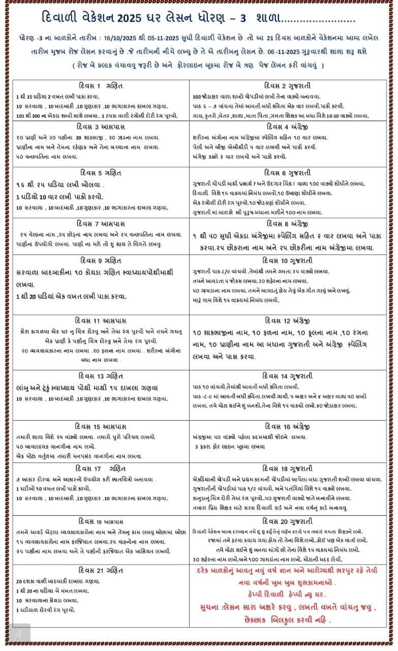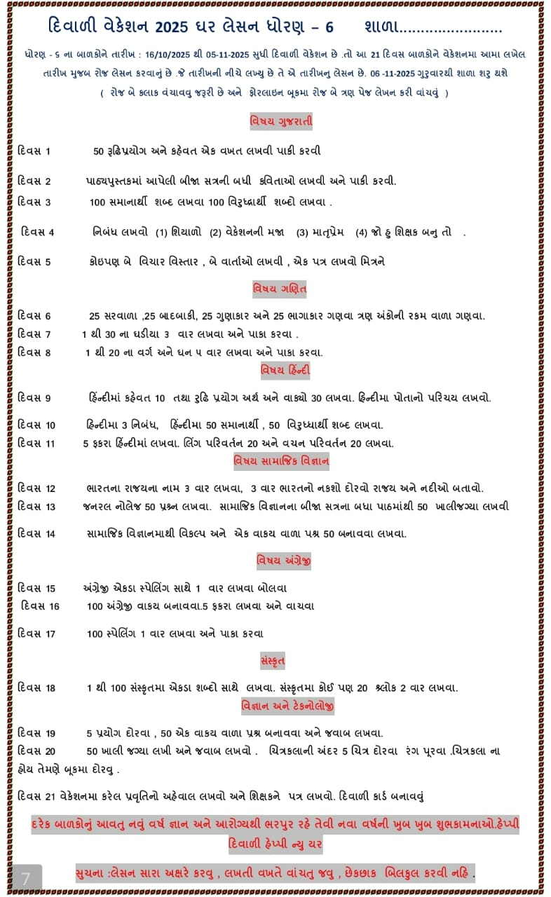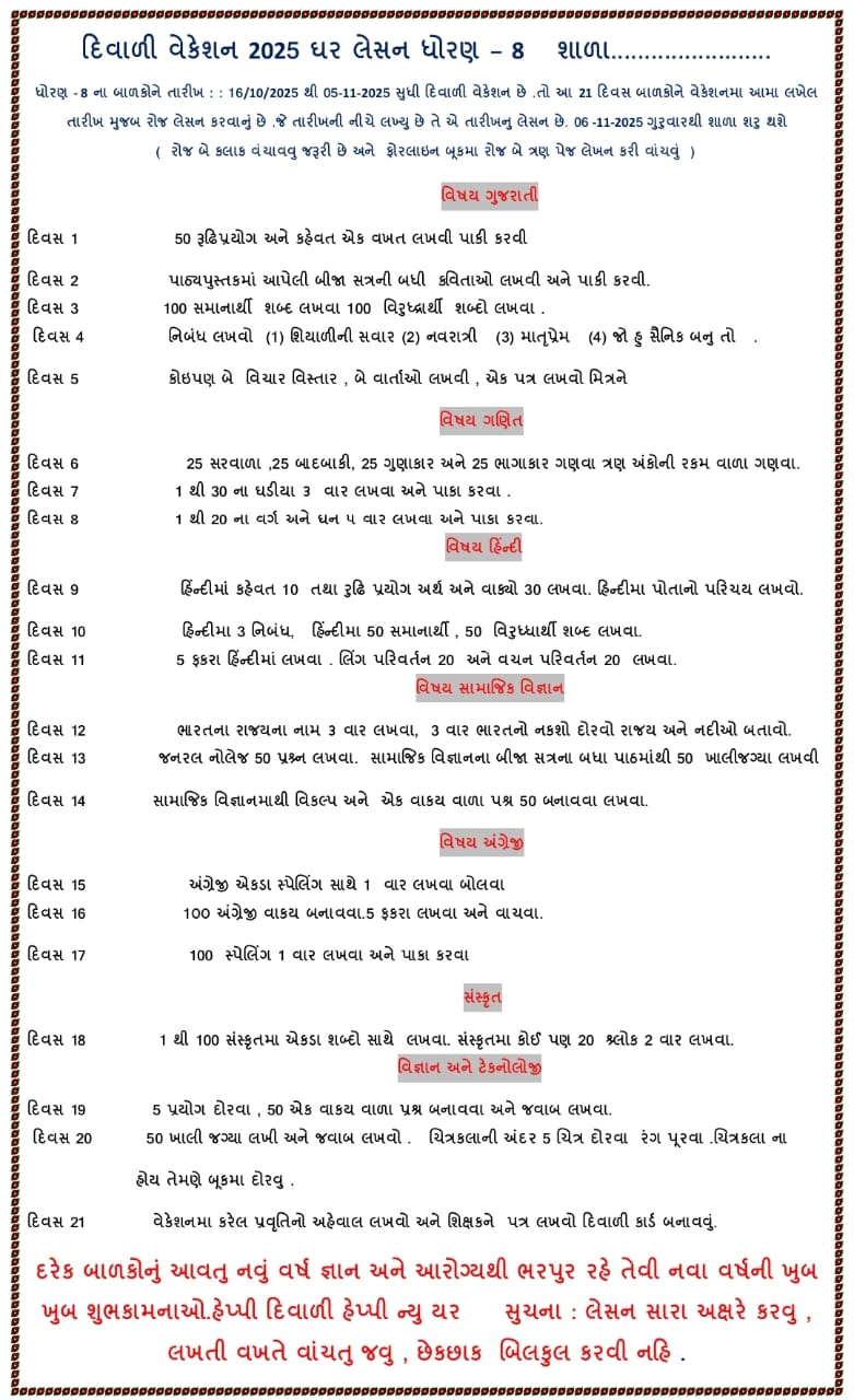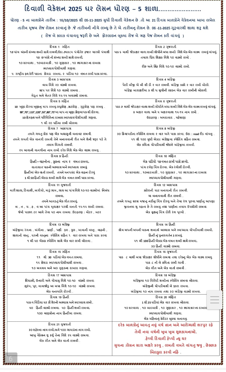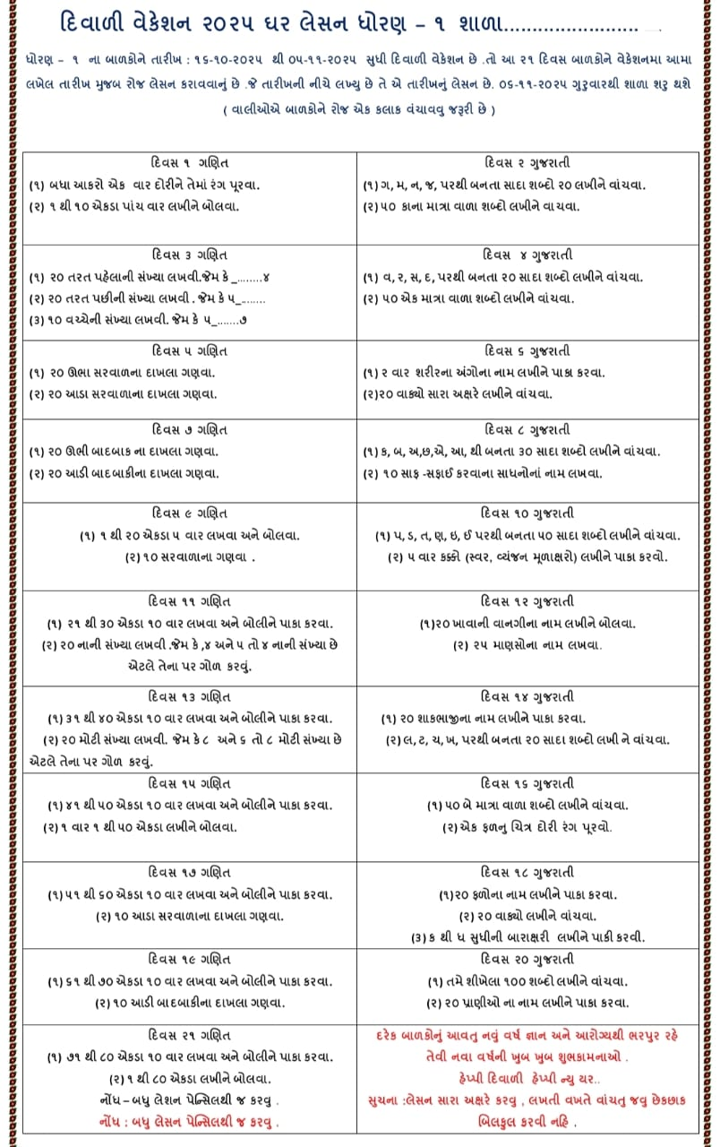 Diwali vacation is a time for joy, celebration, and learning. The Diwali Vacation Homework 2025 for students from Std 1 to 10 helps balance fun with education. It encourages creativity, discipline, and cultural understanding while keeping the festive spirit alive.